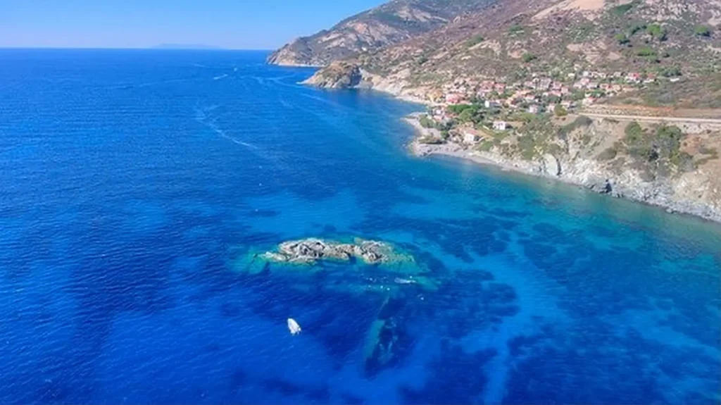 Wreck Beach is located in the small village of Pomonte, a hamlet of the municipality of Marciana, on the south‑western coast of Elba Island. Although often associated with the more famous Marina di Campo, this beach can also be reached easily from there by car in just a few minutes, which is why it is often named in guides as “Wreck Beach Marina di Campo“. This small cove features a mixed shoreline of light gravel and pebbles, surrounded by largely untouched natural surroundings. The water is crystal‑clear and the seabed slopes gently, making it suitable even for less experienced swimmers. However, the real treasure lies just a few meters from shore: the Pomonte Wreck, the skeleton of the merchant vessel Elviscot, which sank in 1972 after hitting the rocks of Ogliera Shoal.